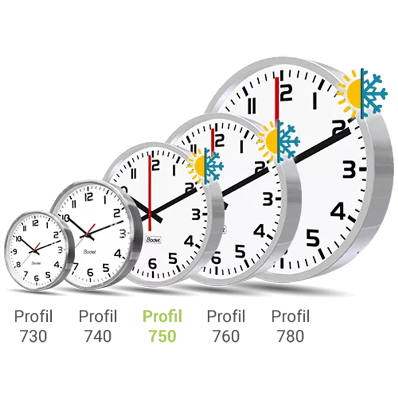 With a 50 cm diameter, the Profil 750 offers reading comfort for passengers up to 50 m away. Its hour/minute or hour/minute/second hands provide passengers with a quick and easy-to-read time display. Moreover, its LED lighting (as an option) makes it readable by night and in underground tunnels.