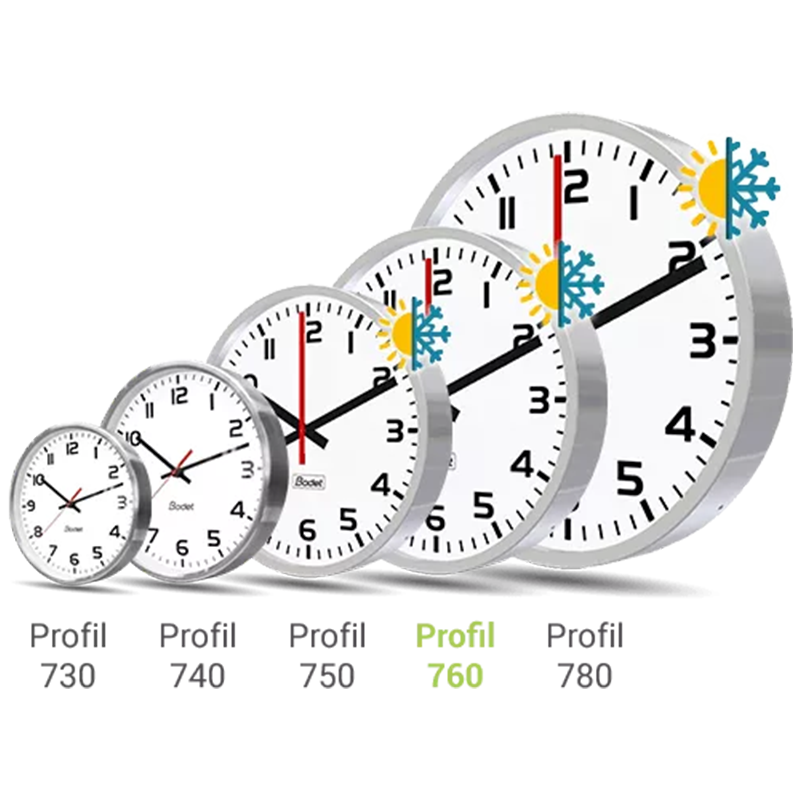 Manufactured at our factory in Trémentines (France), the Profil 760 is the product of over 150 years of clockmaking know-how. Developed by experts in time management, Bodet's clocks offer multiple output protocols for time distribution time distribution. To meet the specific requirements of the transport sector, the Profil 760 metal clock supports the following methods of time distribution: 24V minute impulse, AFNOR, NTP.