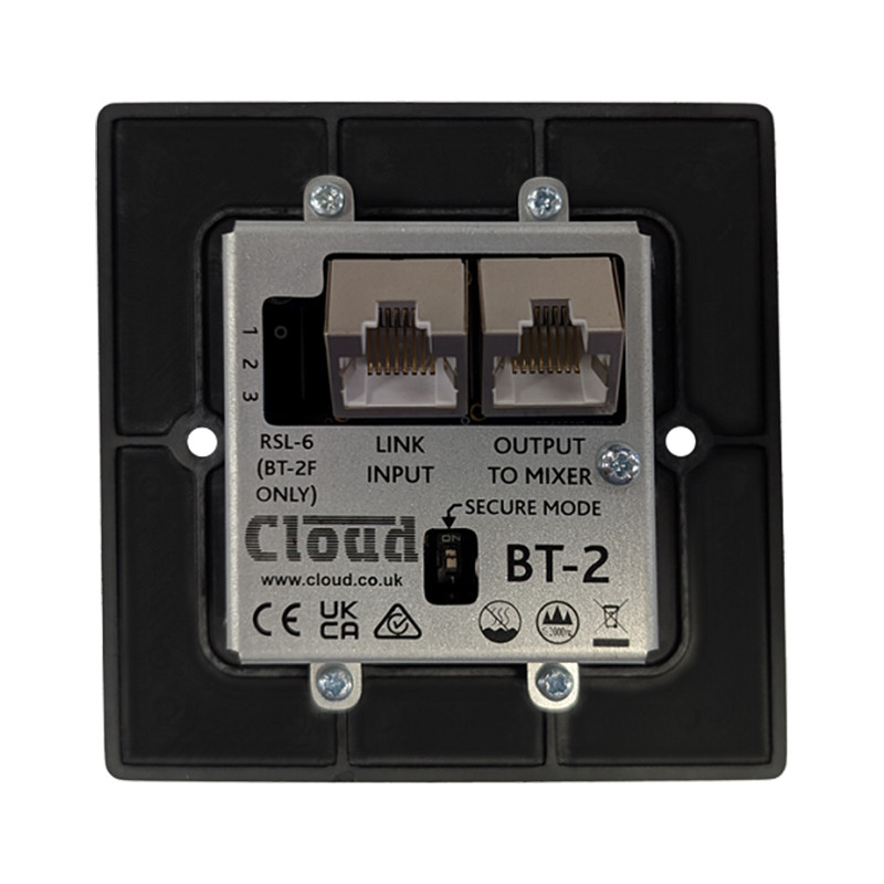 BT-2E is a wall-mounting remote input module for use with Cloud DCM1 Series products fitted with an RJ45 Extension Port. The BT-2 enables compatible portable devices such as laptops, tablets and smartphones to stream audio wirelessly into the installed zone.