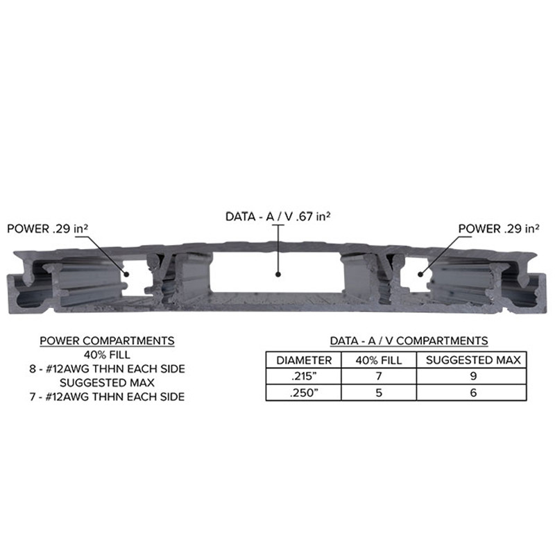 Wire space isn't an issue with the Smart-Way system. The raceway has the capacity to hold (14) 12 AWG (.130" diameter) power conductors, and (9) CAT 5E (.215" diameter), or (5) CAT 6A (.250" diameter) data cables.