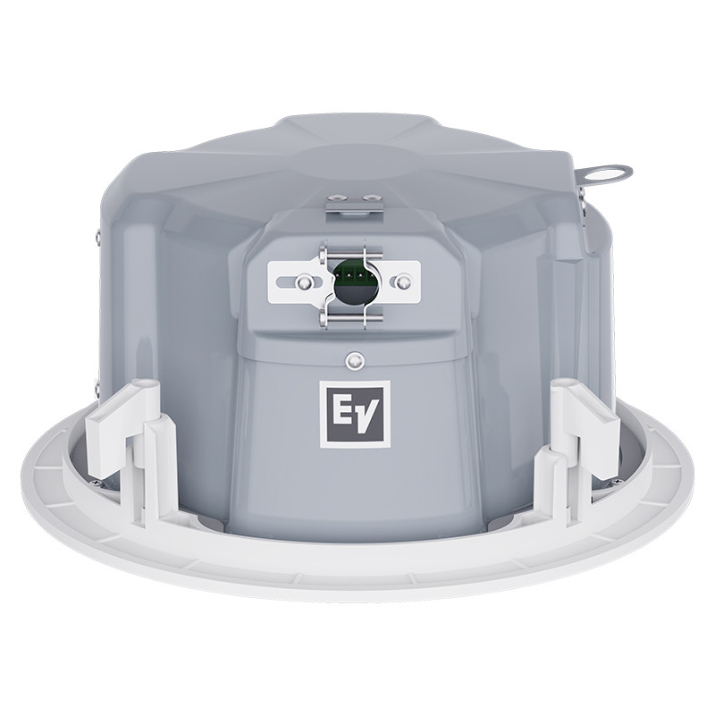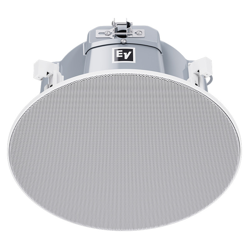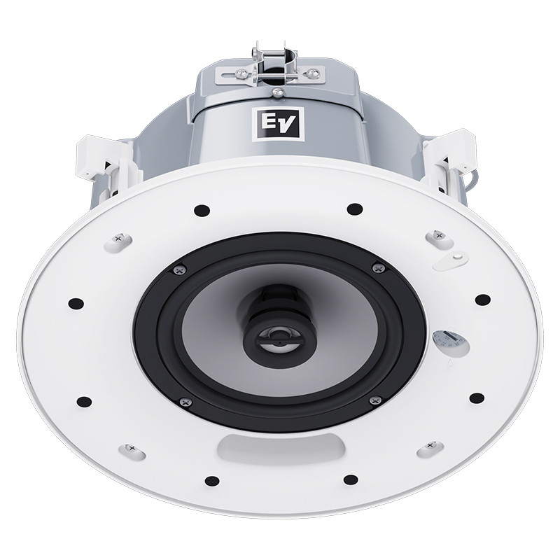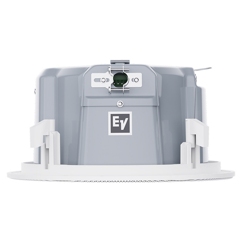 The Electro-Voice EVID-EC6.2E is a complete 6.5-inch coaxial two-way loudspeaker that offers excellent sound quality and outstanding reliability with first-class aesthetics. The EVID-EC6.2E utilizes a transformer that offers a selection of 1.88 (70-V only), 3.75, 7.5, 15 or 30 watts delivered to the loudspeaker system using either 70-V or 100-V lines, or 8-ohm bypass. Selection is via a convenient switch on the front baffle. The perforated grille is finished in semi-gloss white powder-coated enamel. The baffle is constructed from UL 94V-0 rated ABS. The rear enclosure is constructed from heavy gauge coated steel. The low-profile enclosure makes it easy to mount in very tight spaces. A side terminal-cover provides access to a 4-pin terminal block that allows direct connection to the speaker with 12-gauge and 3.3 mm2-wire and provides pass through to additional speakers.