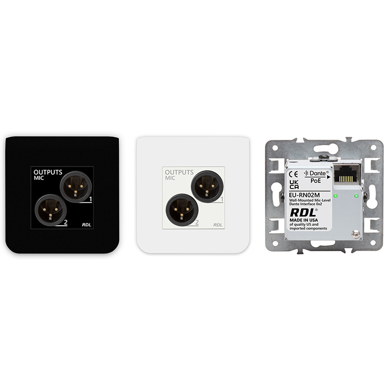 The EU-RN02M is a complete wall-mounted Dante or AES67 audio mic output network interface. It features two balanced XLR mic outputs on the front panel. The module is configured and adjusted using RDL CONSOLE or other network control software. The EU-RN02M fits a standard 60 mm deep European electrical box. The EU-RN02M is PoE powered and is supplied with a white front panel and cover plate. A field-installable black front panel laminate is included with the EU-RN02M.